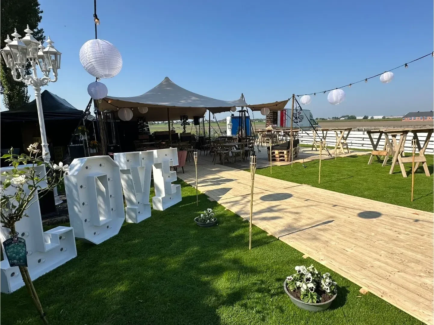 Een foto zegt meer dan duizend woorden. De festivalsfeer, de lampjes in de avond en de open ruimte zorgen voor een unieke setting die je moet voelen om te begrijpen. Kom gerust eens langs om de plek zelf te ervaren.